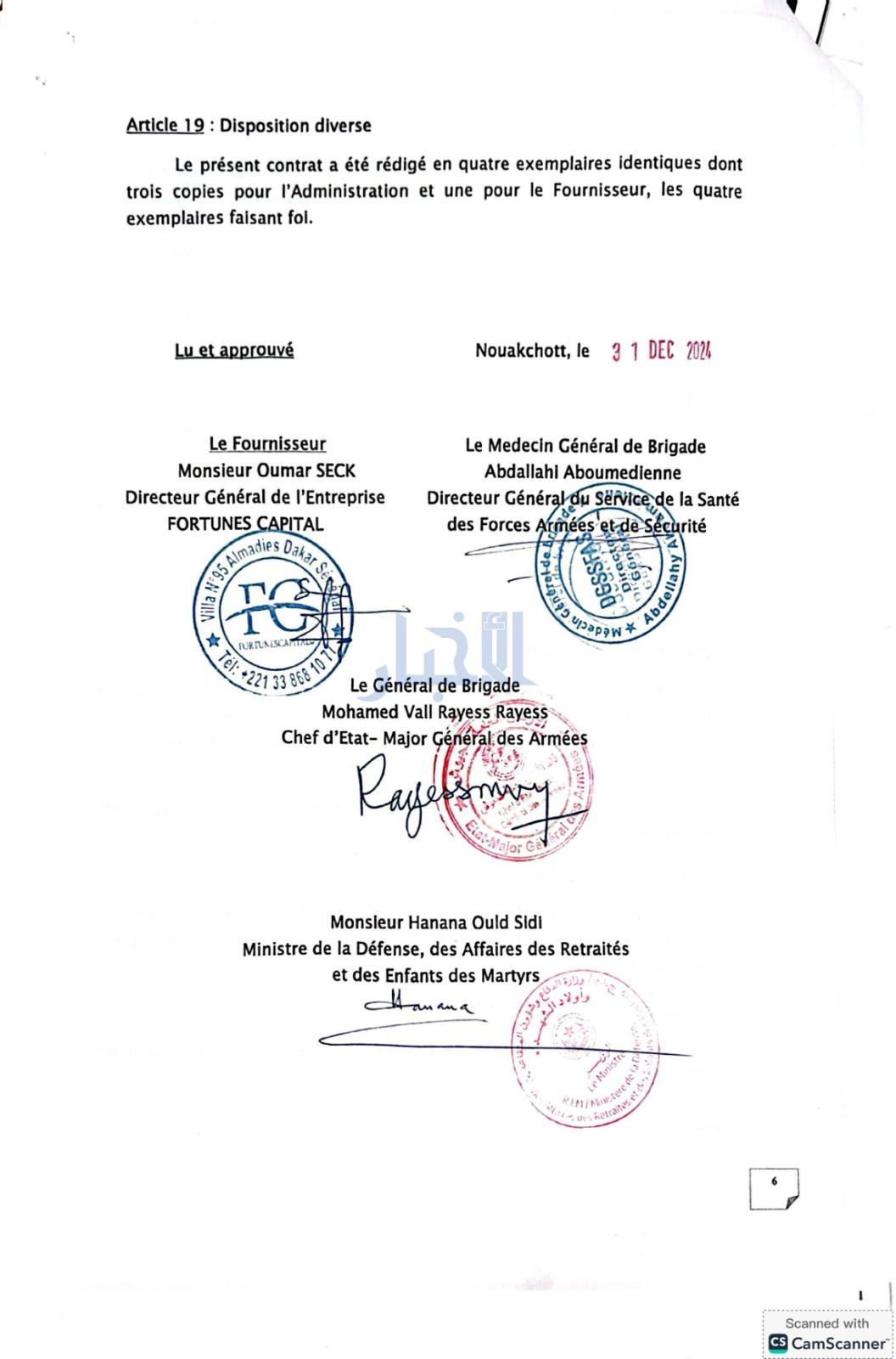 قيادة أركان الجيش، وقّعت صفقة تراض لتوريد المعدات والأجهزة الطبية مع شركة Fortunes Capital السنغالية يوم 31 ديسمبر 2024، وبمبلغ 5.194.800 يورو، لتوفير معدات لمنشآت عمومية، بناء على تمويل من وزارة الصحة.